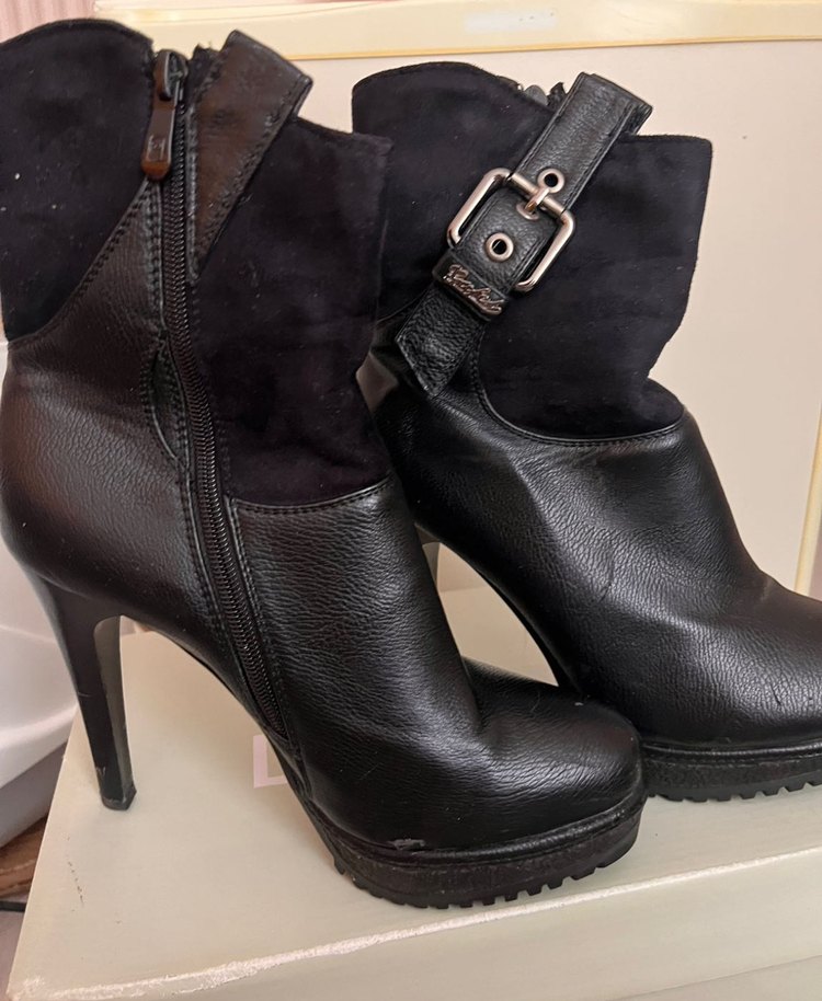 Tokalı, siyah deri kadın botları, sivri topuklu ve cesur bir görünüme sahip. Gotik tarzda desenli, romantik akşamlar için uygun.