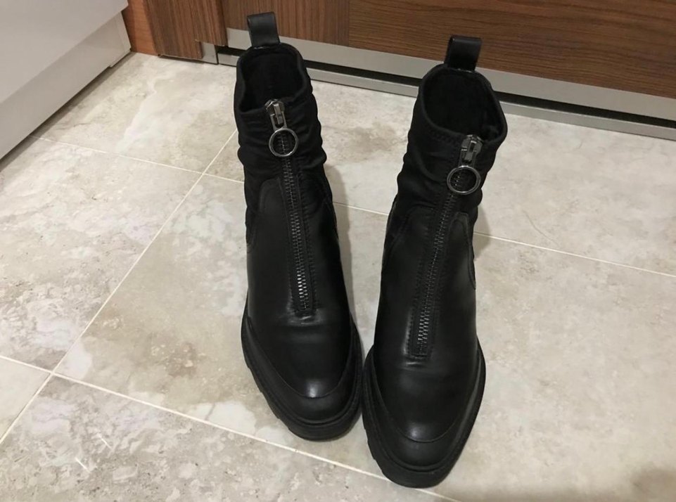 Önden halka detaylı fermuarlı, tokalı siyah deri stiletto topuklu botlar. Minimalist goth tarzıyla günlük kullanıma uygun.