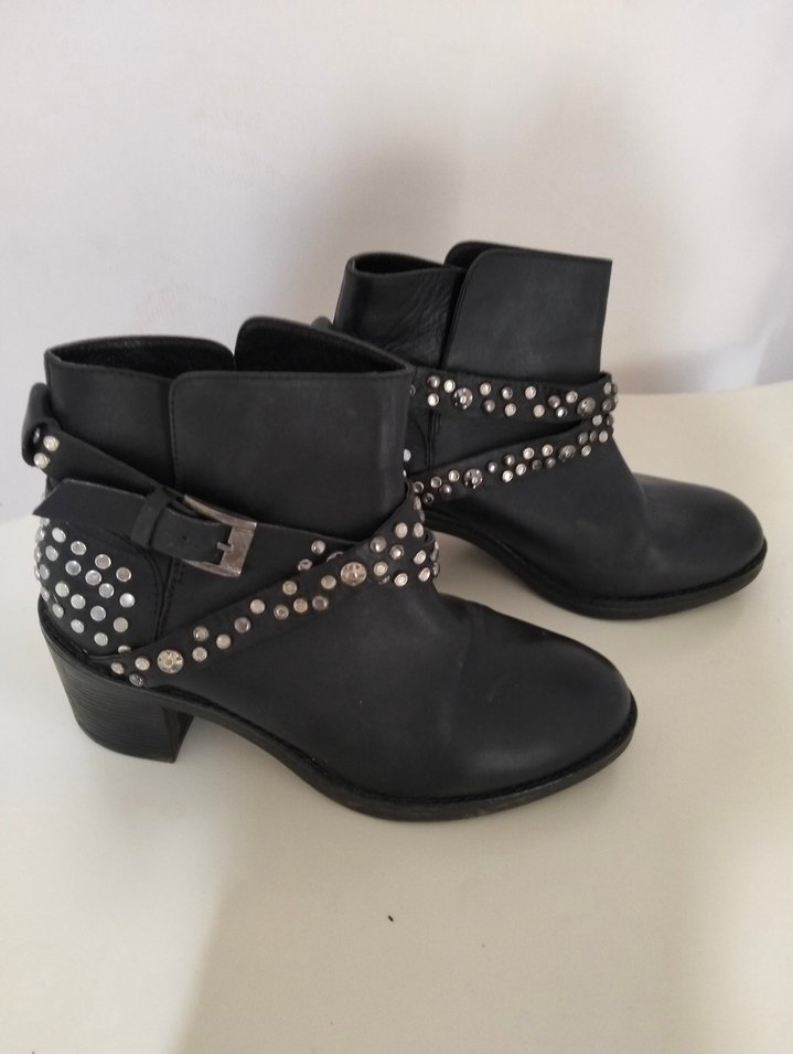 Siyah deri, tokalı kayışlar ve çivili detaylarla süslenmiş blok topuklu botlar. Goth ve grunge punk tarzına uygun, romantik akşamlar için ideal.