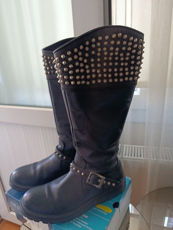 Tokalı bantlı ve çivili desen detaylı siyah deri yüksek topuklu çizme, gotik ve punk tarzını yansıtıyor.