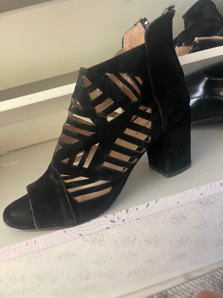 Tokalı detaylı, desenli siyah blok topuklu kadın ayakkabısı. Kauçuk malzemeden, romantik akşamlar için uygun.