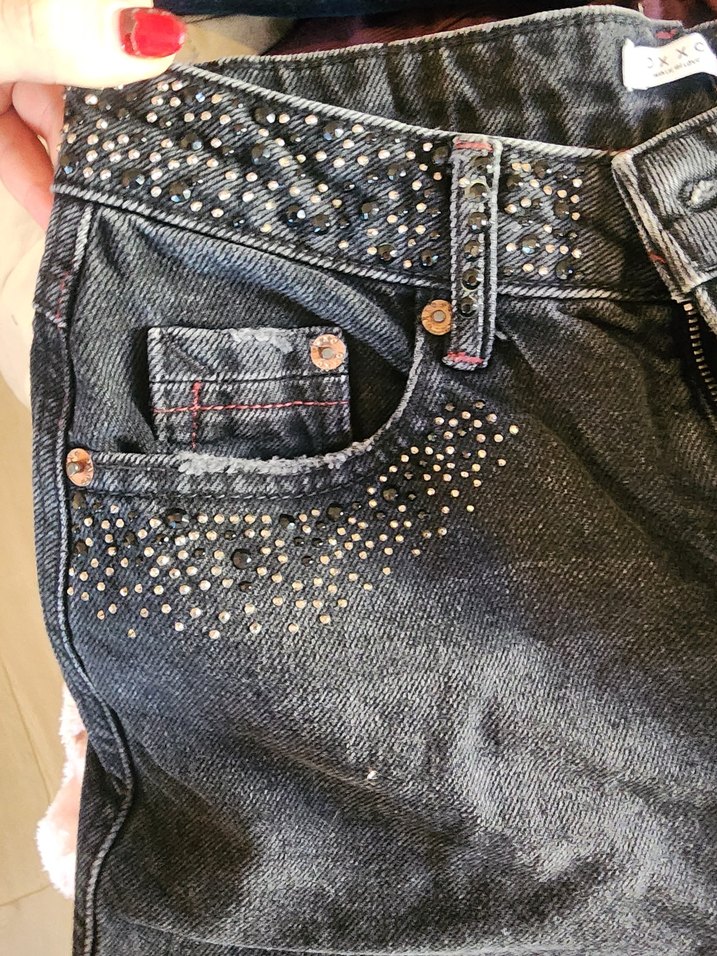 Tokalı siyah denim kot pantolon, desenli ve çivili detaylara sahip. Midi boyu ve rock punk tarzıyla günlük kullanıma uygun.