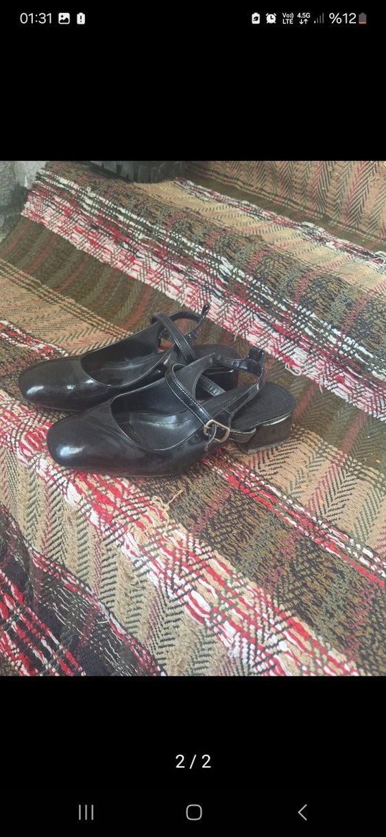 Siyah renkte, tokalı ve dolgu topuklu, kauçuk malzemeden yapılmış klasik tarzda kadın ayakkabısı. Günlük kullanıma uygun.