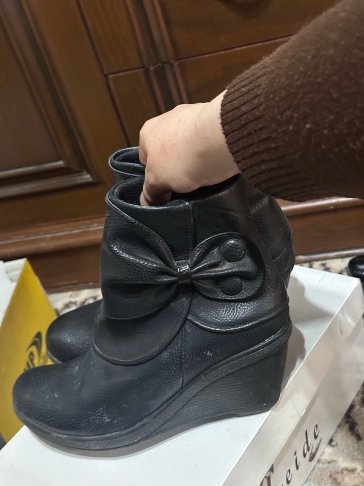 Tokalı detaylı, siyah dolgu topuklu kadın botları, kauçuk malzemeden yapılmıştır ve günlük kullanıma uygundur.