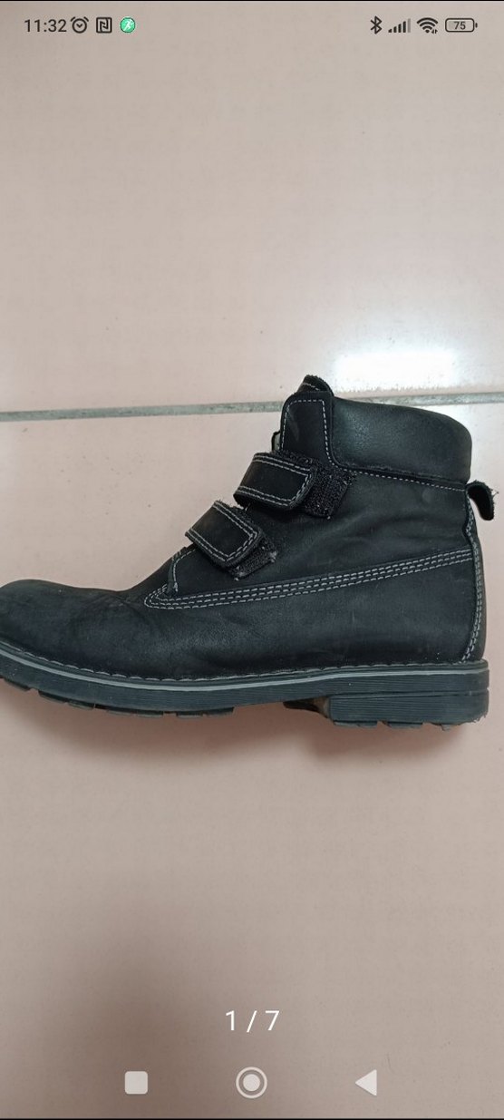 Hakiki deridir birkac kez giyilmistir Tokalı kayışlara ve sağlam kauçuk tabana sahip siyah erkek çocuk botu, trend sokak stili için uygun. Düz ve koyu gri tonlarda yüzey içerir.