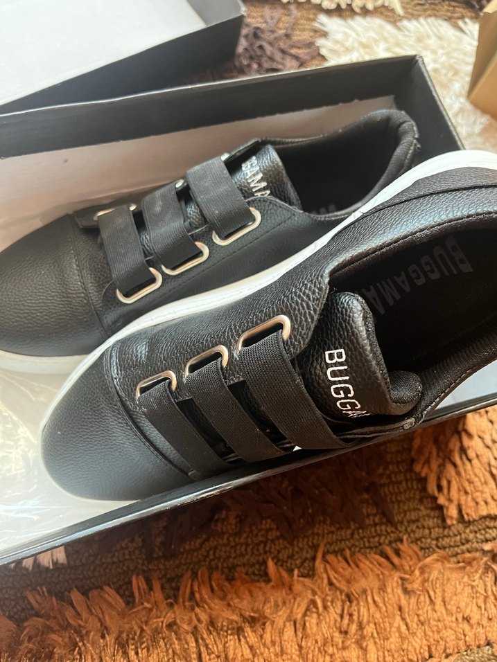 Tokalı bantlı, parlak desenli siyah kadın spor ayakkabısı. Kauçuk tabanlı, blok topuklu ve BUGG markalı.