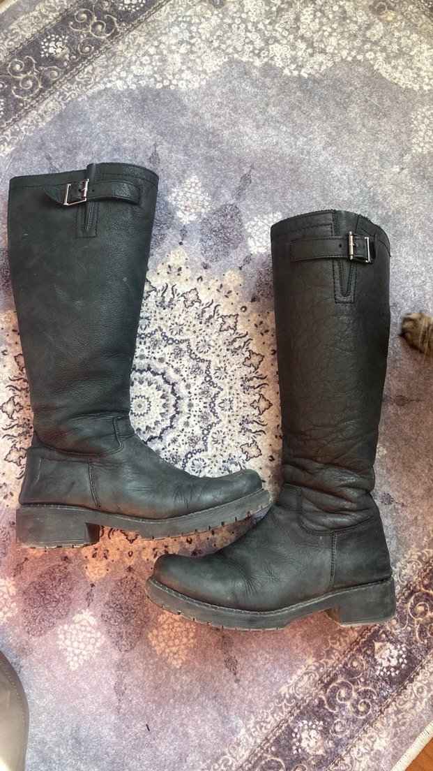 Tokalı detaylı, blok topuklu siyah deri dizüstü kadın çizmesi; grunge punk ve gotik tarzıyla günlük kullanıma uygun. Ürün temiz az kullanıldı gerçek deri olduğu için çok güzel işitiyor 39 numara yazıyor fakat 38 numaraya daha uyumlu