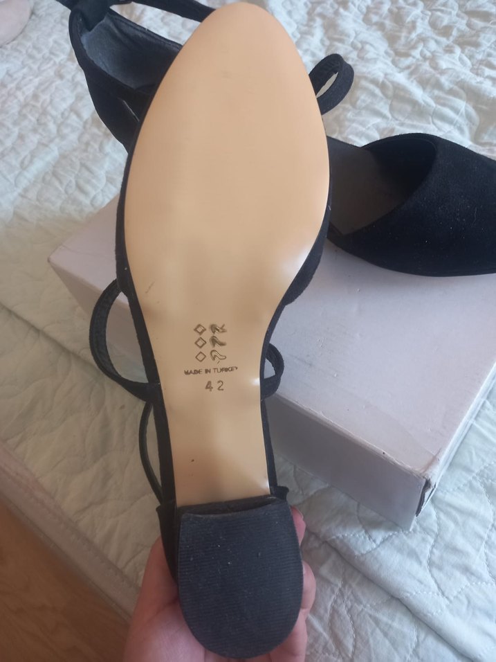 Siyah, tokalı ve blok topuklu kadın gece ayakkabısı. Lastik tabanlı ve baskılı detaylarıyla romantik akşamlar için uygun gotik stile sahip.