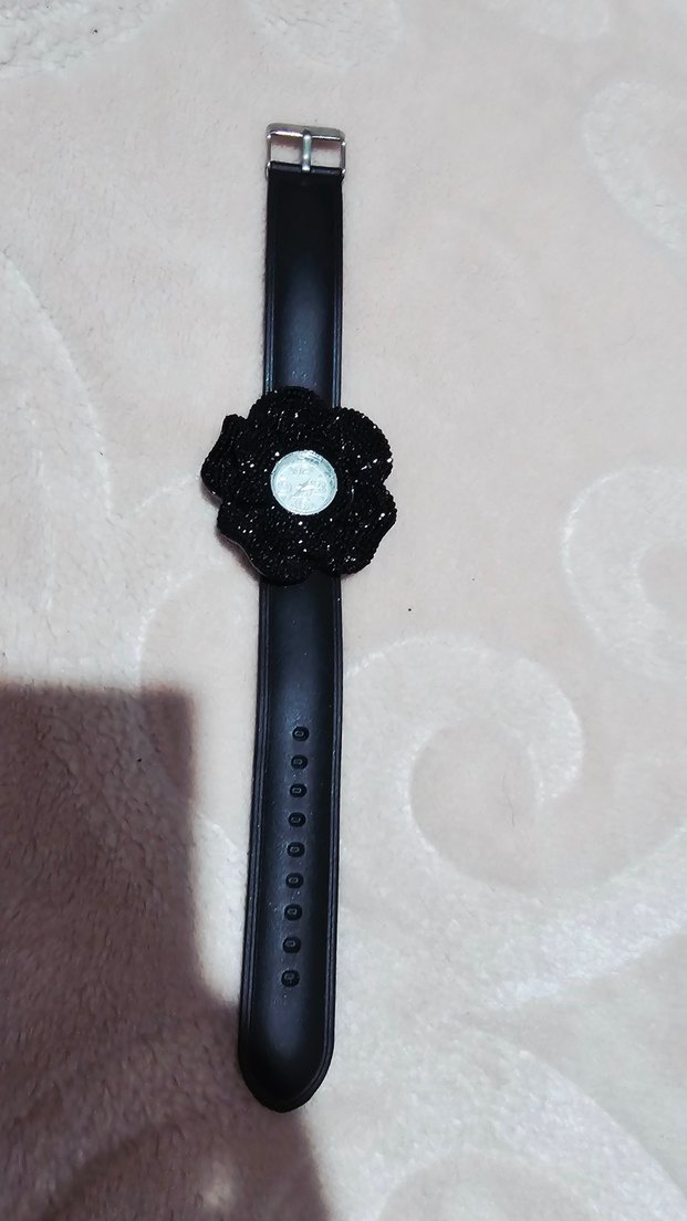 Tokalı kayışa sahip siyah gotik kadın saati, çiçek şeklinde dekoratif detaylarla minimalist ve renkli bir tasarım sunar.