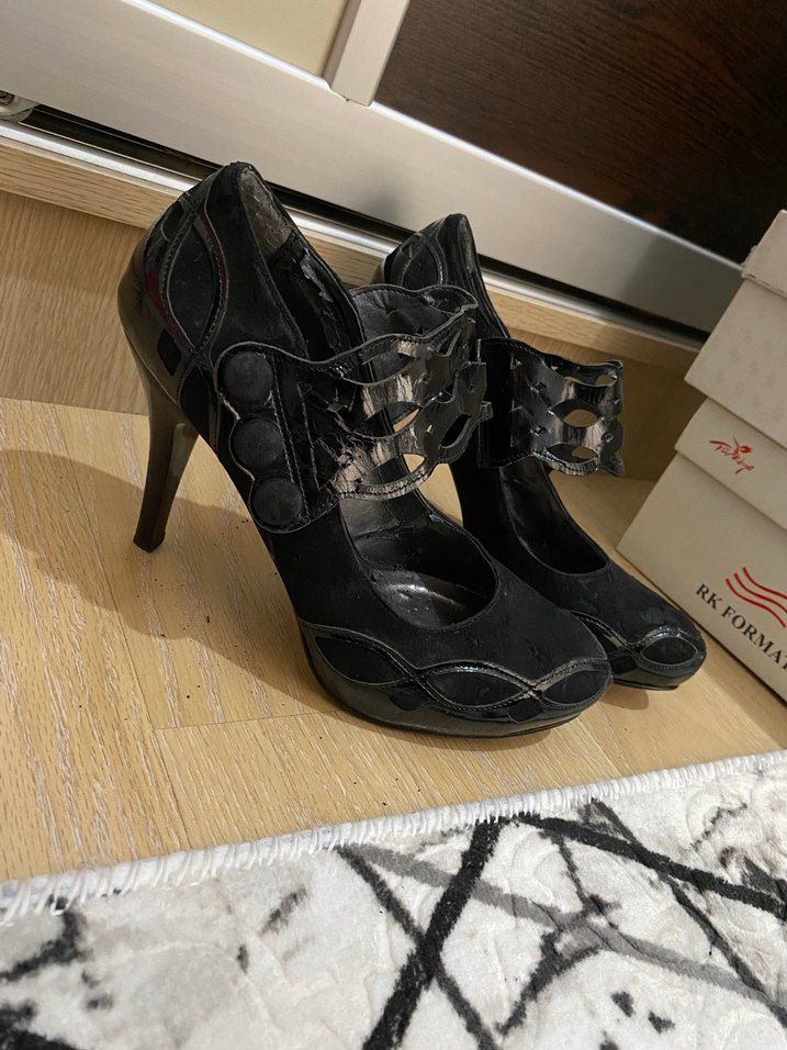 Tokalı kayış detaylı, desenli siyah yüksek topuklu stiletto. Gotik tarzda, romantik akşamlar için uygun.
