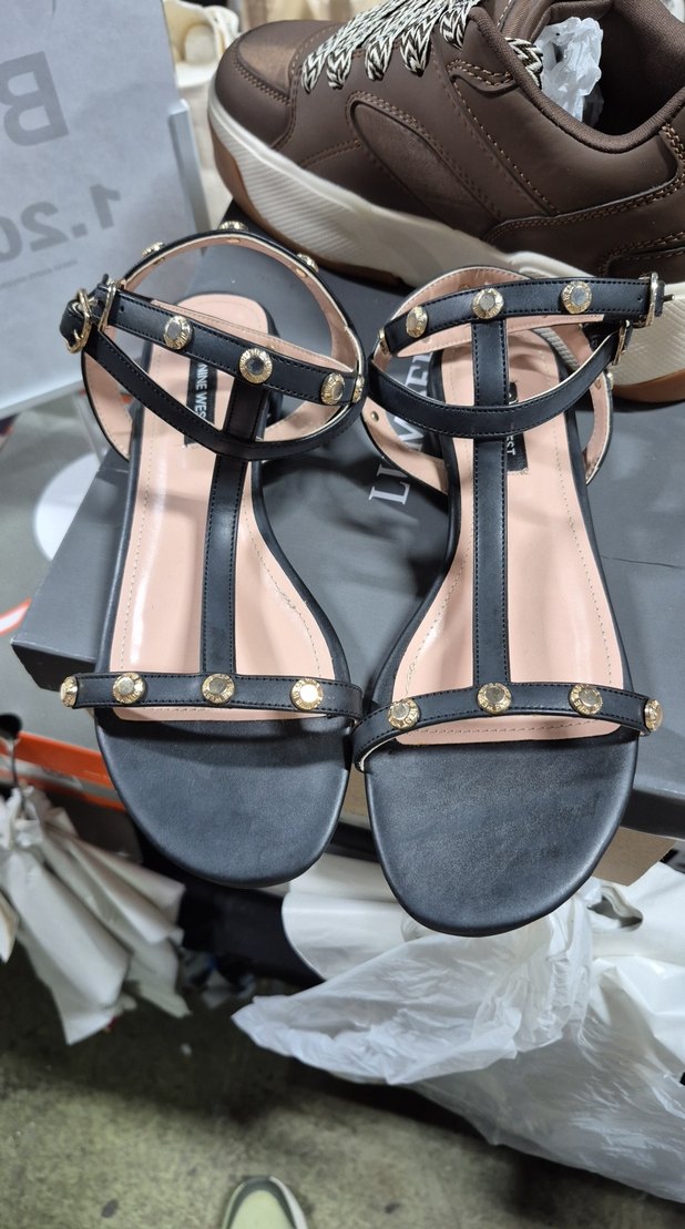 Tokalı bantları ve süs taşları olan siyah kadın blok topuklu sandalet. Kauçuk malzemeden yapılmıştır, günlük sokak modasına uygun.