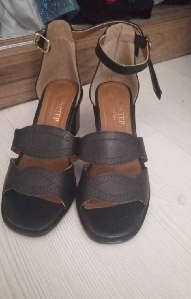 Tokalı kayışları ve blok topukları olan siyah kadın sandaletleri. Kauçuk malzemeden yapılmıştır, günlük kullanıma uygundur.