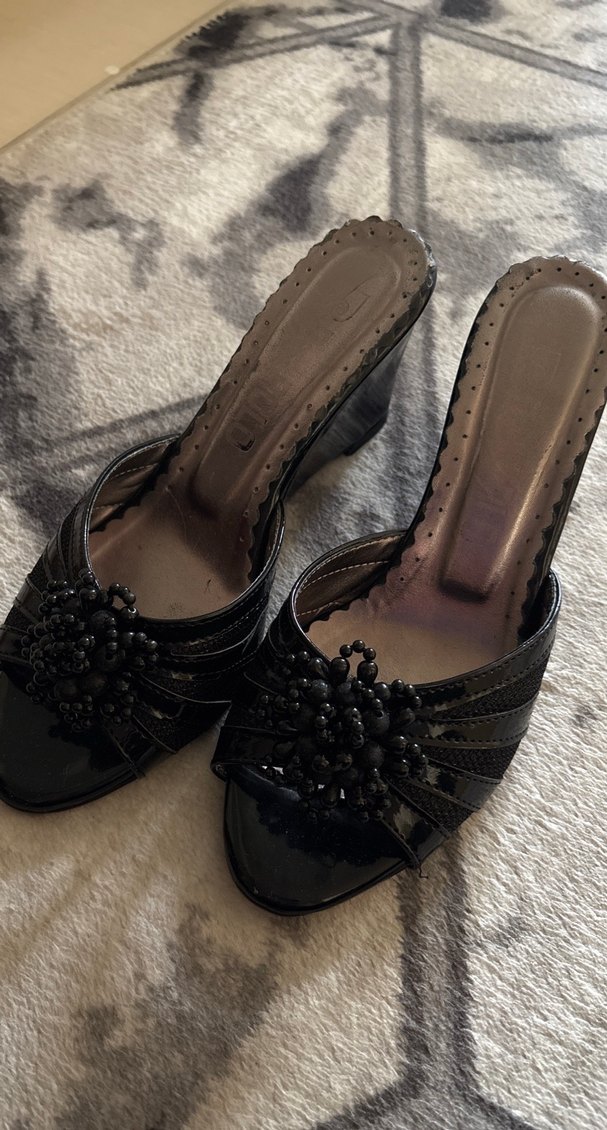 Tokalı tasarımı ve desenli detayları olan siyah kadın dolgu topuk terlikler. Kauçuk malzemeden yapılmış, gotik tarzda, klasik şıklık ve günlük rahatlık sunar.