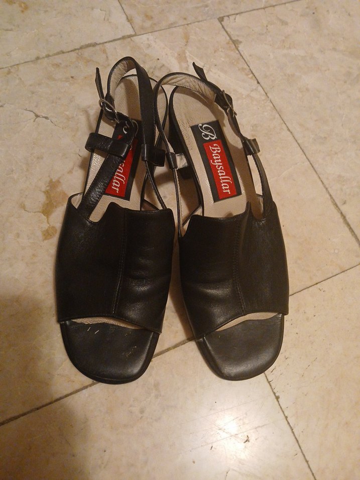 BBaysallar markalı, tokalı siyah dolgu topuklu kadın sandalet. Koyu renkte ve desensiz kauçuk malzemeden yapılmıştır.