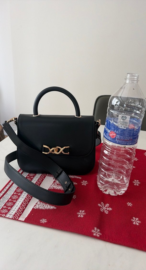 Tokalı kapama ve baskılı detaylara sahip siyah kadın el çantası, üst sap ve ayarlanabilir omuz askısıyla çok yönlü kullanım sunar.