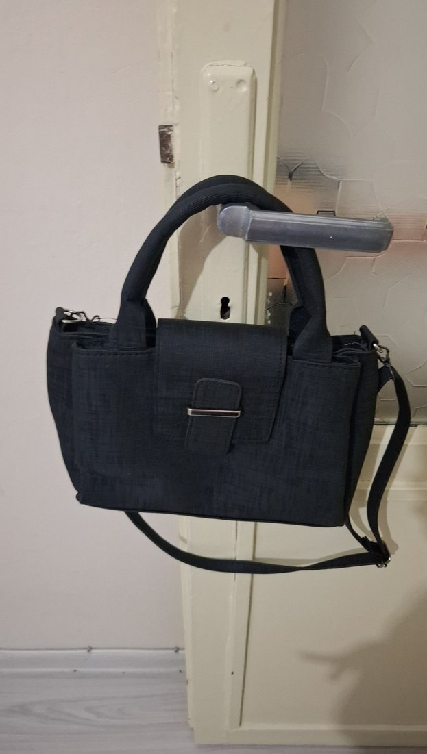 Tokalı kapamalı, ayarlanabilir askılı siyah sentetik kumaş kadın çantası, minimalist ve çağdaş tasarıma sahiptir. Günlük kullanıma uygundur.