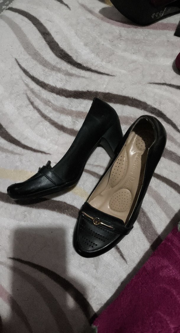 Lastik malzemeden yapılmış, tokalı, siyah kadın klasik topuklu ayakkabı. Ofis kullanımı için uygun, geleneksel stile sahip.