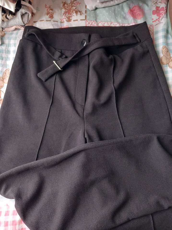 Tokalı kemerli, düz siyah kadın kumaş pantolon. Normal boy ve regular fit kesime sahip, iş ortamı için uygun.