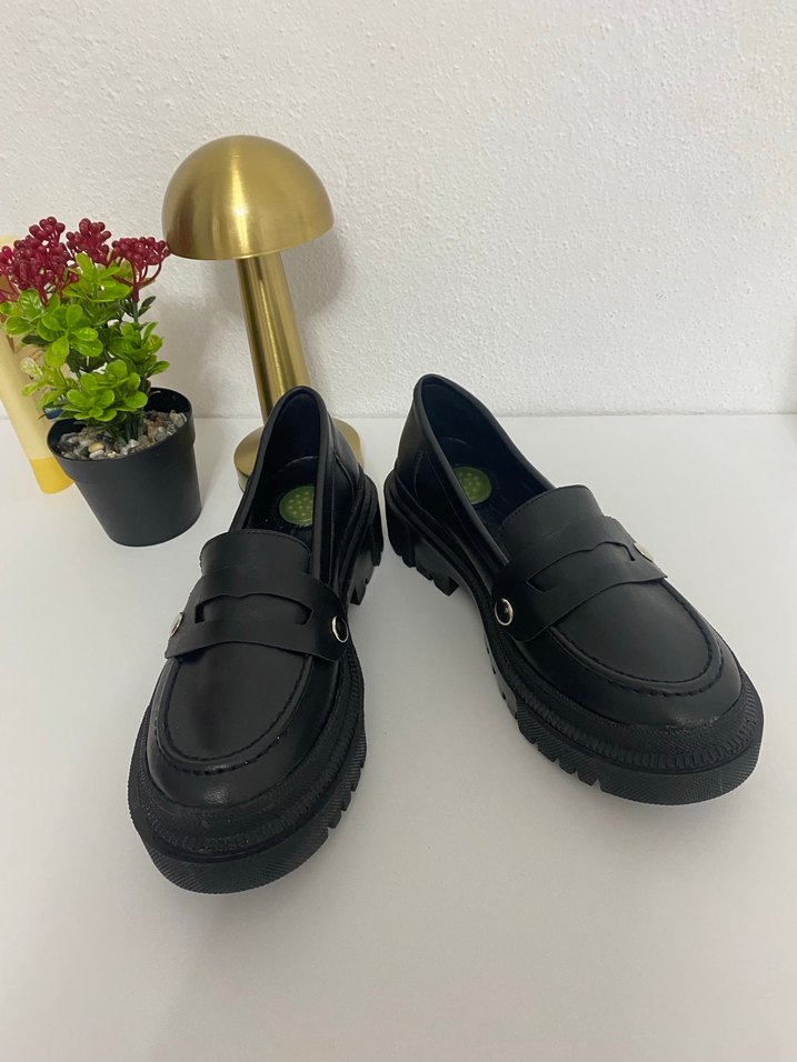 Tokalı detaylı siyah platform topuklu kadın loafer. Dayanıklı kauçuk malzemeden yapılmış, çiçek desenli ve kalın tabanlı, ofis için uygun, trend goth tarzı ayakkabı.
