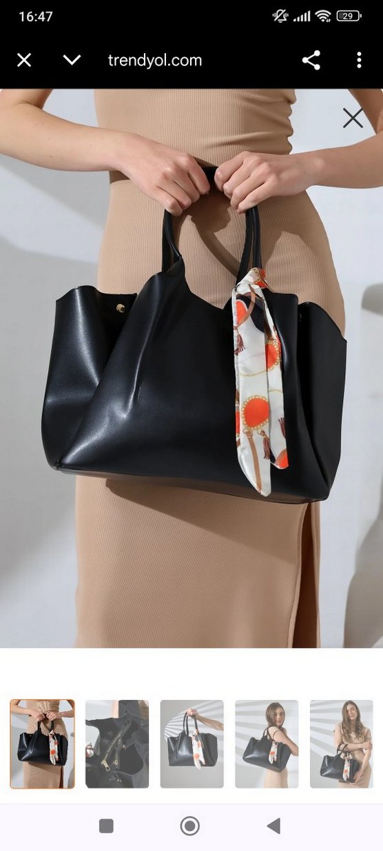 Tokalı tasarıma sahip siyah sentetik kumaştan kadın omuz çantası, üzerindeki desenli fular ile günlük kullanım için uygundur.