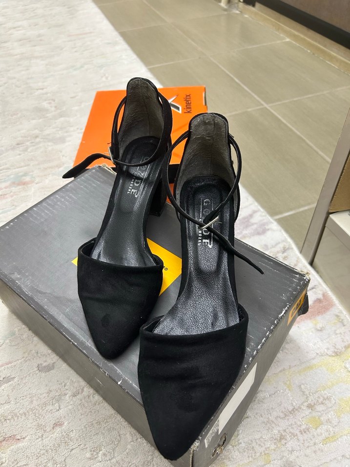 Tokalı bantlı, siyah kadın topuklu ayakkabı. Süet 37 beden
