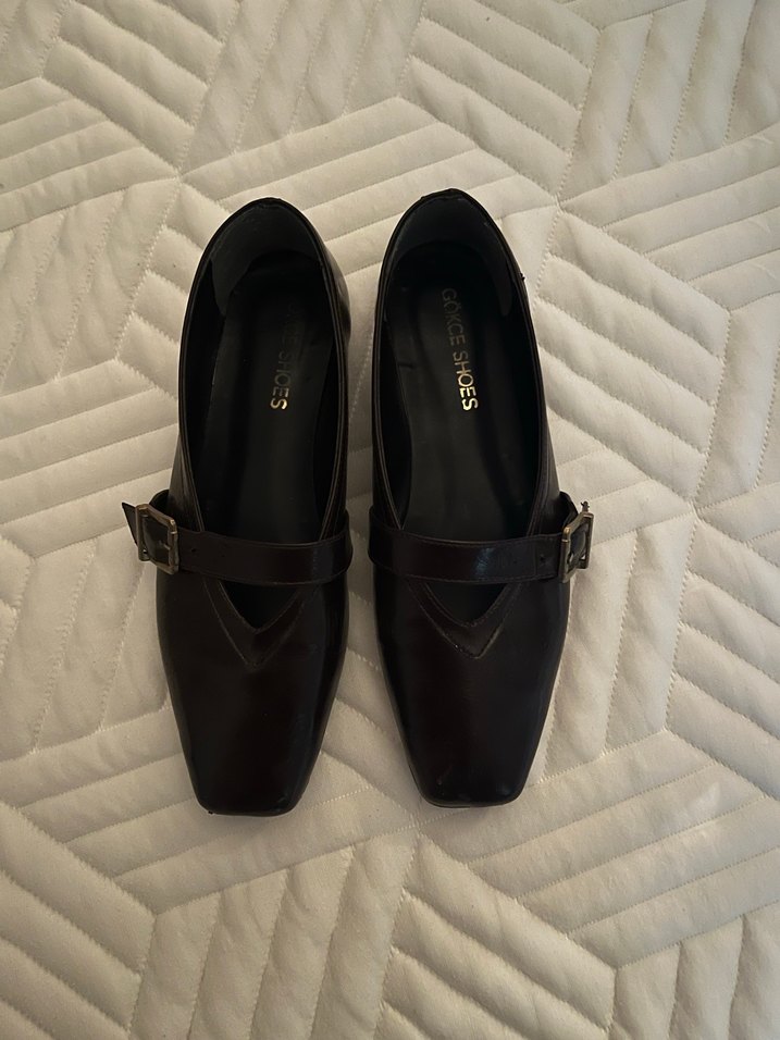 Tokalı, blok topuklu acı kahve babet, desensiz şık tasarım ofis ve avangart tarzlara uygundur. Temiz ve az kullanıldı.hakiki deri