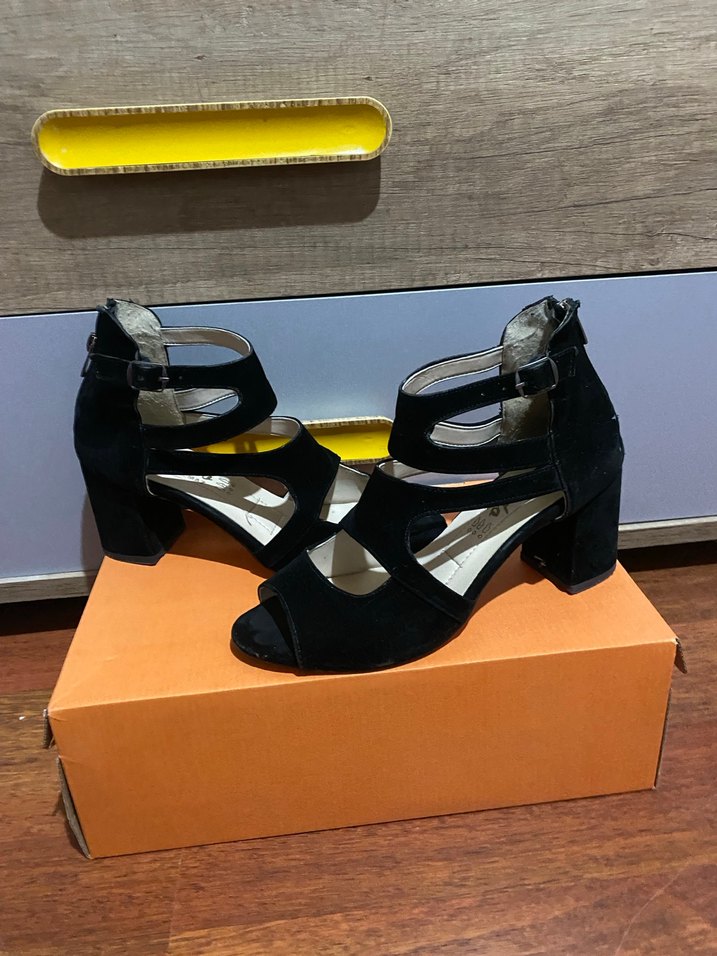 Tokalı ve baskılı desene sahip siyah kadın topuklu sandalet, dayanıklı kauçuk malzemeden üretilmiştir. Romantik akşamlar için çağdaş ve minimalist tarzda.