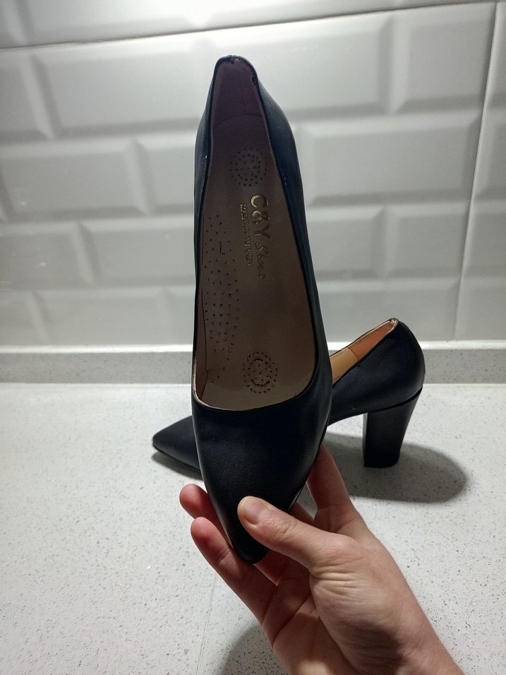 Tokalı, güçlü blok topuklu siyah kadın stiletto. Dayanıklı kauçuk malzemeden üretilmiş, desen içermeyen, çağdaş Paris tarzında ofis ayakkabısı.