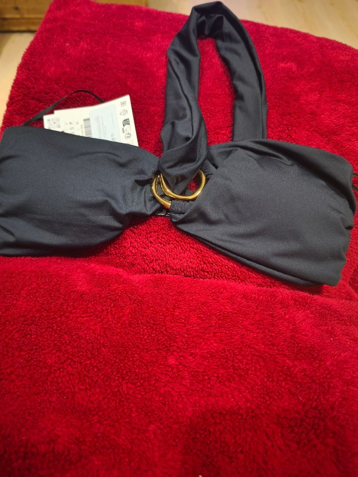 Tokalı detaylı, askılı siyah bikini üstü. Sıkı oturan ve cesur tarzı ile minimalist desenli, dış mekan kullanıma uygun.