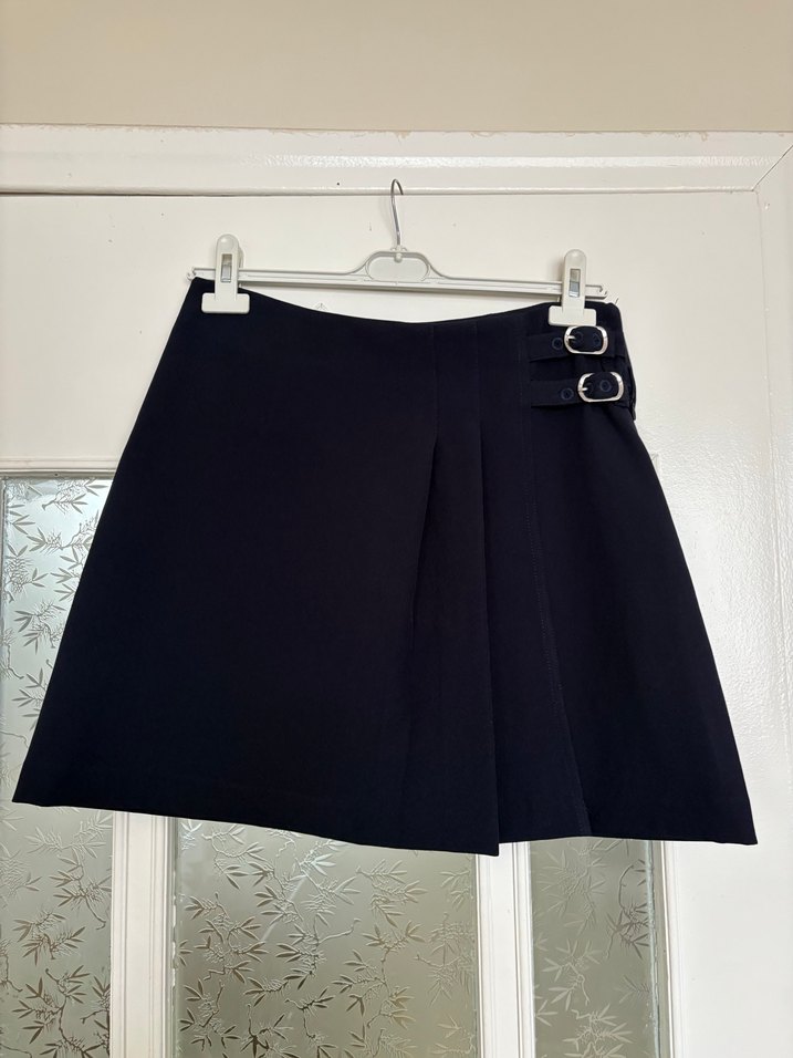 Lacivert mini etek, bol kesim ve yan tarafında iki tokalı kayış ile sade, düz desensiz yapıda, yumuşak sentetik kumaştan üretilmiştir.
