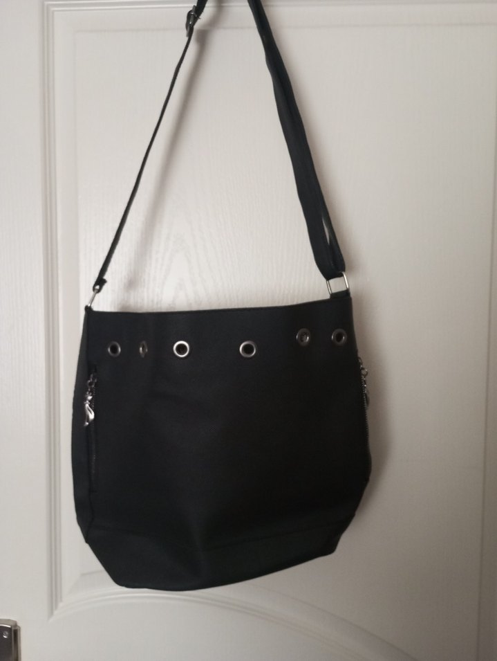 Tokalı detaylara sahip siyah minimalist kadın çantası, sentetik kumaştan üretilmiş ve günlük kullanıma uygundur.