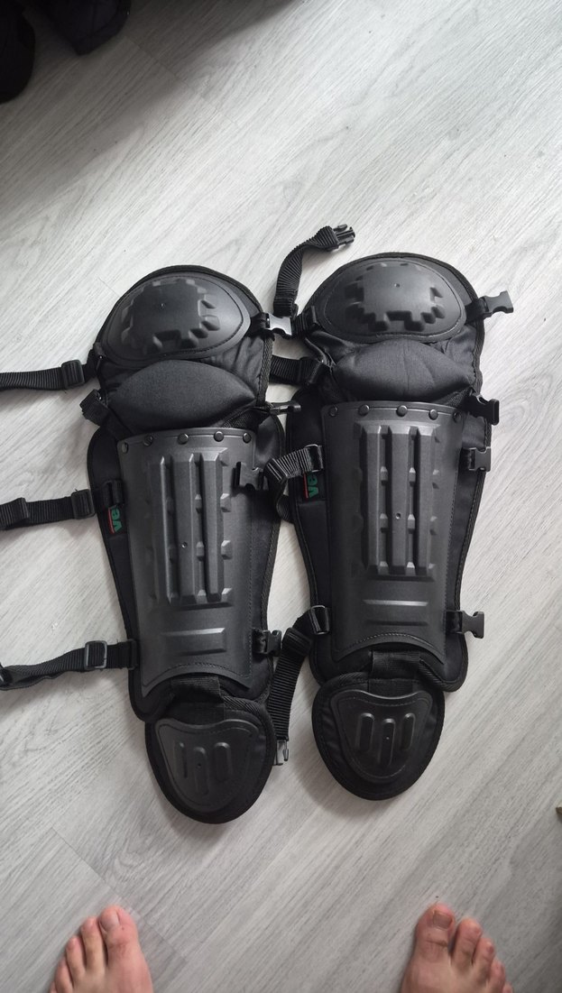 Dayanıklı kauçuk malzemeden yapılmış, tokalı siyah motosiklet dizlikleri mafsallı modeldir.