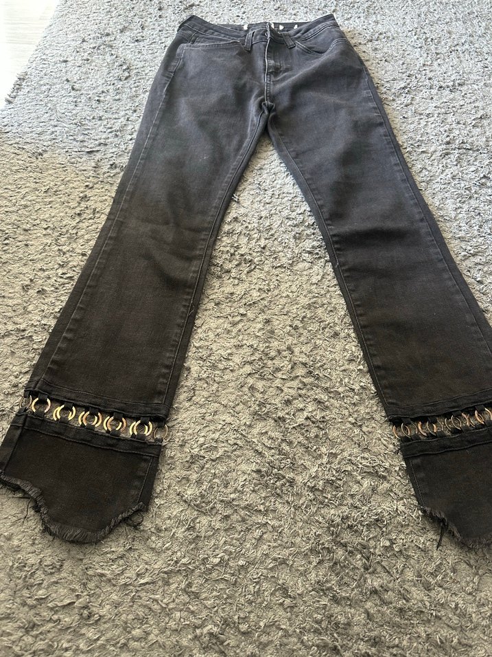 Nakış detaylı ve tokalı siyah kot pantolon, midi boyda ve regular fit, günlük kullanıma uygun.