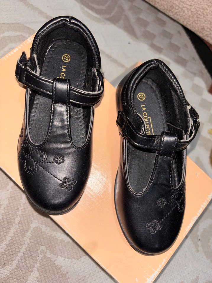 Siyah, nakışlı detaylara sahip tokalı kız babet ayakkabısı. Kauçuk malzemeden yapılmış, hafif gotik tarzda. 'LAC' işaretli.