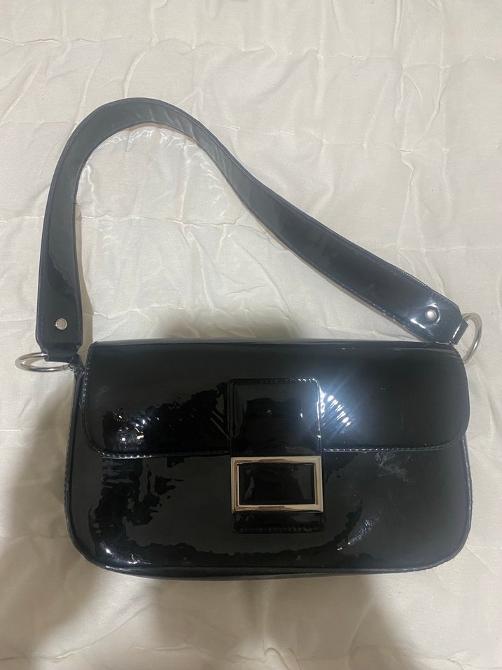Tokalı kapaklı, parlak baskılı siyah deri kadın çantasıdır., günlük kullanıma uygundur.iç kumaşında lekeler mevcut onun dışında kusuru yok artık kullanmadığımdan satıyorum