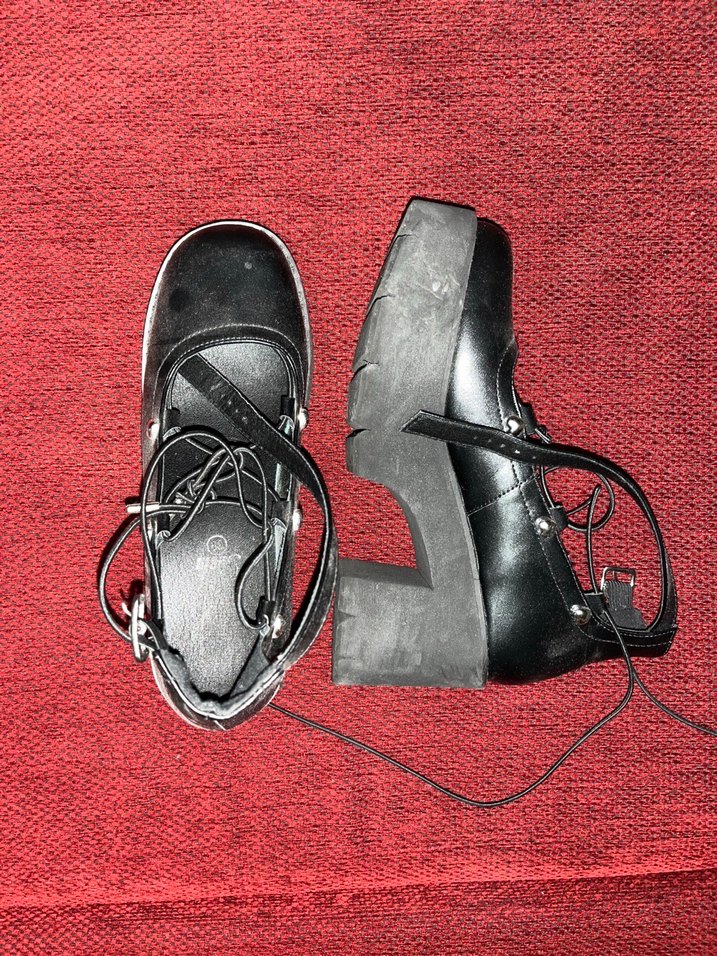 Tokalı bantları ve kareli deseniyle siyah gotik kadın ayakkabısı. Kauçuk malzemeden, platform topuklu, rock punk havası verir.