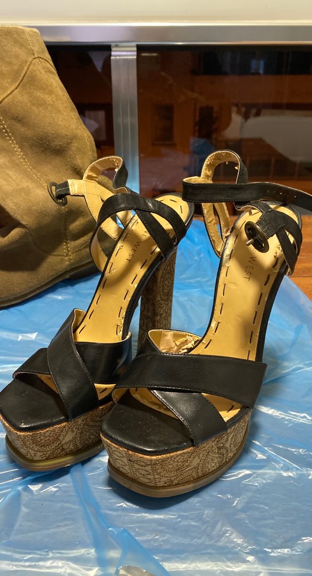 Tokalı bantlara sahip, desenli kauçuk tabanlı siyah platform topuklu kadın ayakkabısı. Cesur ve bohem tarz için uygundur. 15 cm topuk