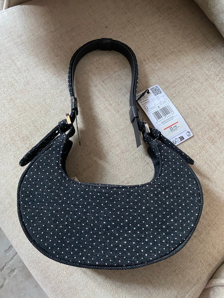 Tokalı askısı ve taşlı deseniyle siyah denim çanta, günlük kullanıma uygun şık bir seçenek.
