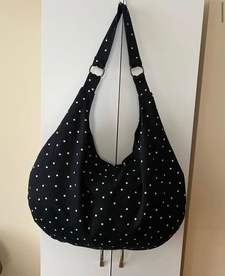 Siyah zemin üzerine beyaz puantiyeli, tokalı askılı sentetik kumaş kadın çantası. Minimalist ve gotik tarzda, günlük kullanım için uygundur.