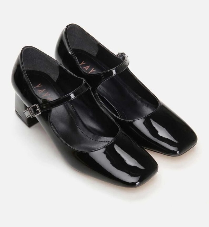 Siyah rugan malzemeden yapılmış, tokalı ve blok topuklu klasik kadın ayakkabısı, gotik stil ile zarafeti birleştirir, ofis kullanımı için uygundur.