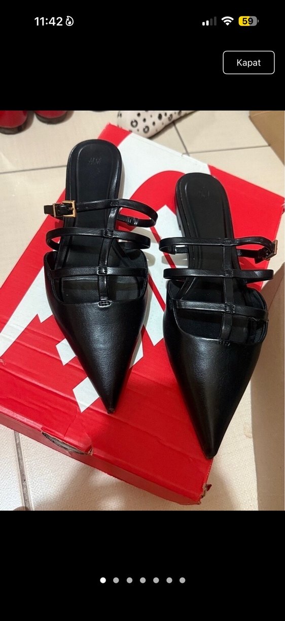 Siyah renkli, lastik malzemeden yapılmış sivri uçlu ve tokalı kayışlara sahip stiletto topuklu kadın terlikler. Romantik akşamlar için uygun.
