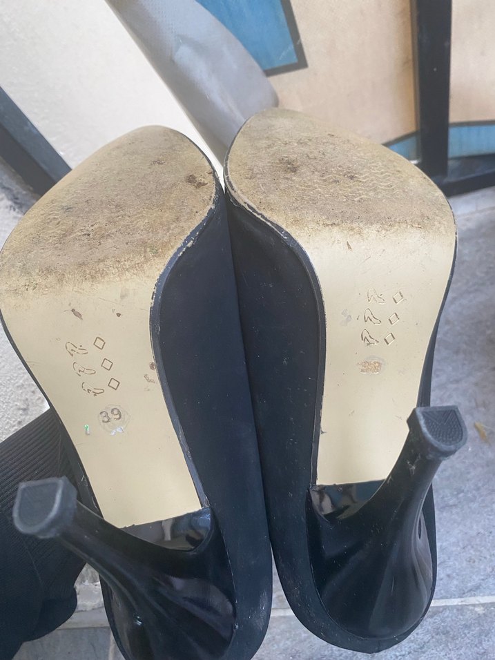 Tokalı detaylı, dayanıklı kauçuk malzemeden yapılmış siyah stiletto topuklu ayakkabı. 39 numara, dış mekan kullanımı için uygundur.