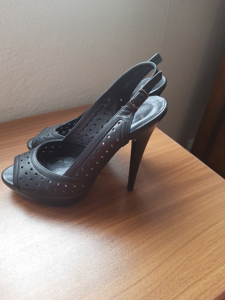 Tokalı kayışlı, desenli siyah kadın stiletto topuklu ayakkabı. Kauçuk malzemeden yapılmış, gotik ve cesur bir tarz için uygun.