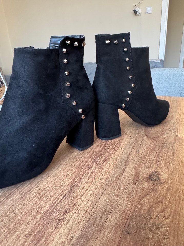 Tokalı tasarıma sahip, süet dokulu, siyah renkli topuklu botlar. Romantik akşamlar için uygun, desenli ve şık görünümlü.