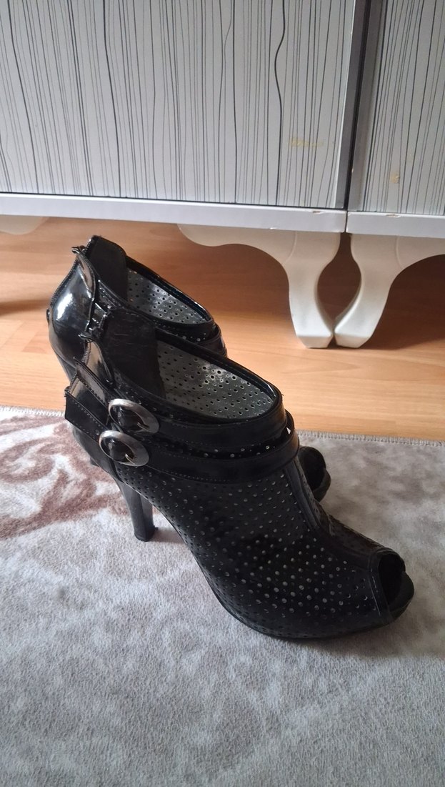 Tokalı, desenli siyah topuklu ayakkabılar. Kauçuk malzemeden yapılmış, gotik ve modaya uygun bir tarz sunar. çok güzel duruyor beğendiğim ve kullandıgım bir ayakkabıydı küçük geldiği için satıyorum uc kısımlarda hafif soyulma var ama dikkat çekmiyor oje ile kapatılabilir