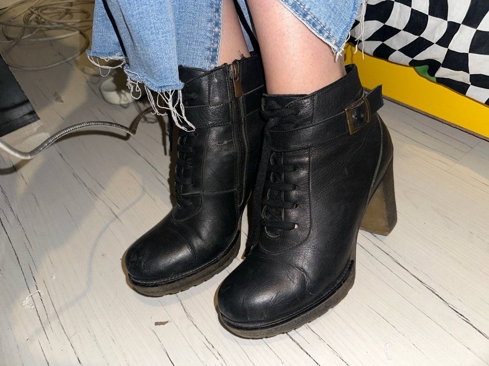 Tokalı siyah dolgu topuklu botlar, deri malzemeden üretilmiştir. 39 numara ama 40 da olur bağcıkları ayarlarsanız.çok rahat bir ayakkabı gerçek deri 5 cm topuk