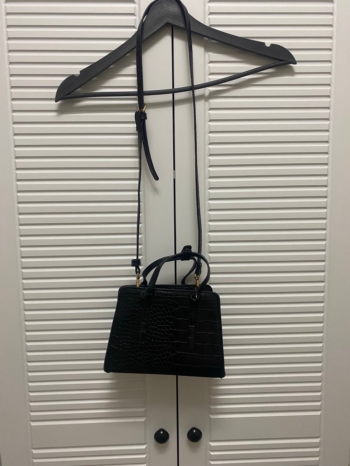 Tokalı kayışa sahip, yılan derisi desenli siyah deri çanta. Günlük kullanıma uygun çağdaş Paris tarzını yansıtıyor.