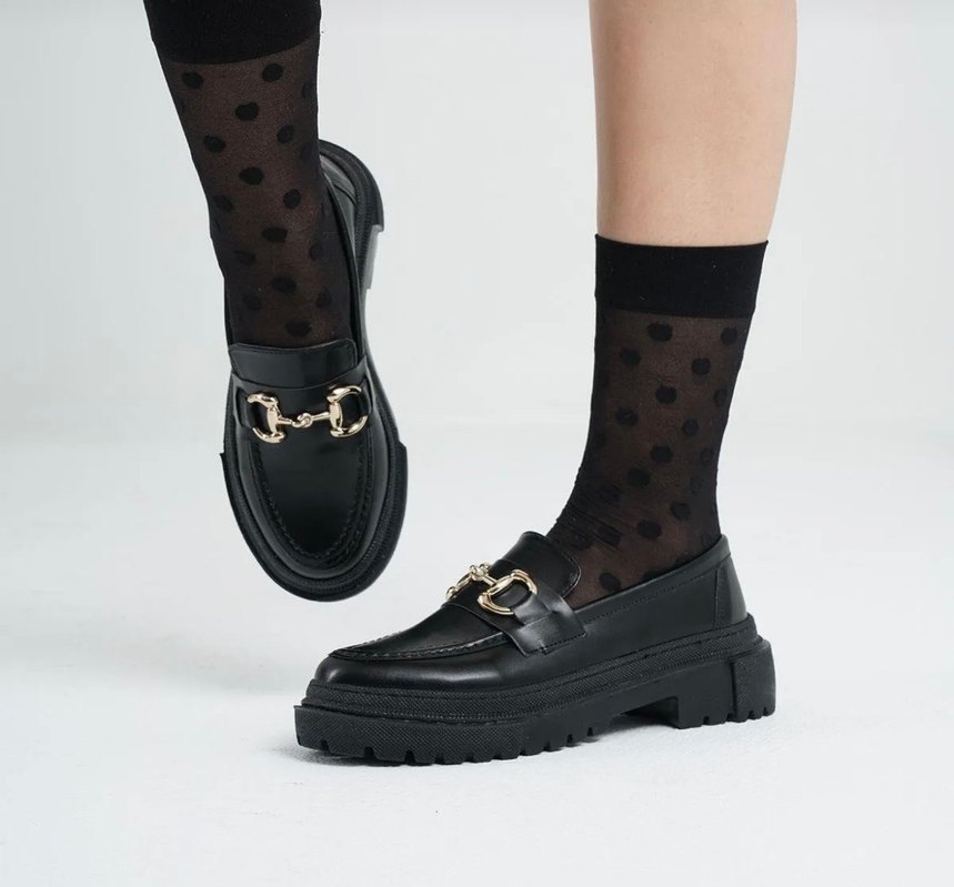 Tokalı detaylı, yılan derisi desenli siyah kadın loafer modeli platform topukludur ve klasik modern ofis stiline uygundur.