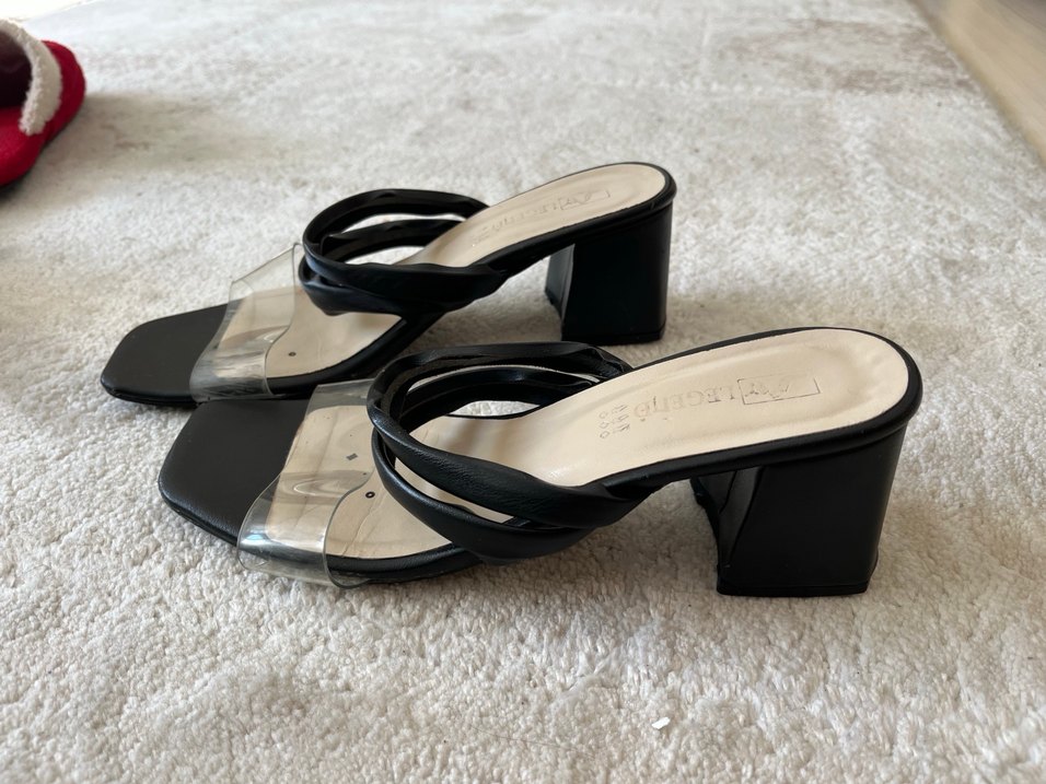 Tokalı detaylı, yılan desenli siyah blok topuklu terlik. Kauçuk tabanlı, modern klasik stil, günlük kullanıma uygun.