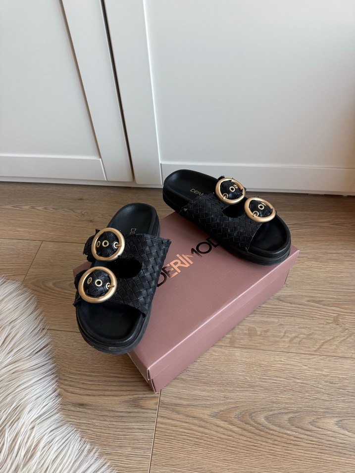 Siyah yılan desenli, altın tokalı platform terlik. Birkaç defa giydim detaylar görselleri görebilirsiniz. Kauçuk malzemeden, rahat ve şık. Trendy casual ve romantik akşamlar için uygun.